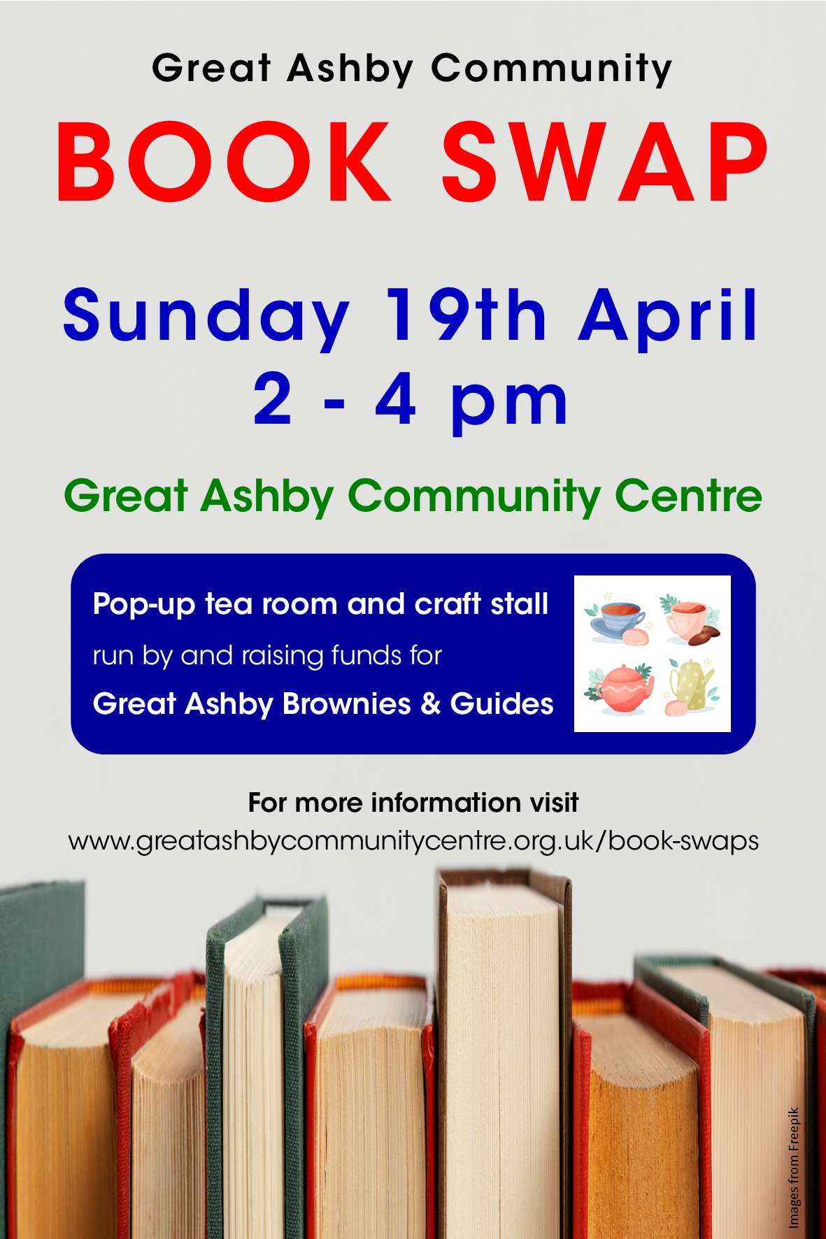 At the Great Ashby Community Centre our Community Book Swaps are free events. There is no entry fee and we don’t charge for any books that you want to take. (Of course, we never say no to cash donations which go towards running the community centre!)